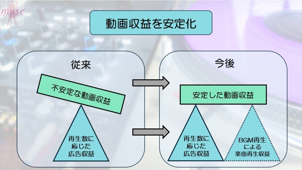今後の収益モデルでは、そこに自作BGMを流すことで発生する楽曲再生収益をプラスし、従来より